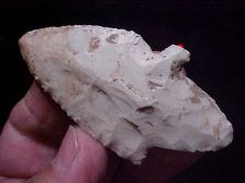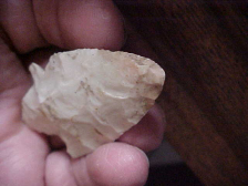 Since I put the piece in my collection I've been trying to figure out the purpose of that side tang--did the blade keep moving in it's handle, enough so that the Woodland hunter carved an extra notch to wrap the knife tighter? That'd make sense, it's not a shaft scraper, you can see some finer pressure chipped flakes off what's practically a 'side notch'--neat feature. The Waubesa is made of a heat treated Burlington/ Crescent Quarry Chert,2&9/16" by 1&5/16". There is a thicker (3/8") measurement in the center of the hafting area--could be that little bit of a 'stack' was why the side notch was made. I tried for a closeup of the tip where there is a small impact fracture--less than 1/8" was chipped off in usage. Patina is everywhere, every detail is guaranteed authentic. Shipping is by USPS minimum cost of $7.00--yeah, no cheap shipping through the P.O. these days, lol. I welcome checks, cash, or M.O.s, but do not use paypal-type services--Roy a.