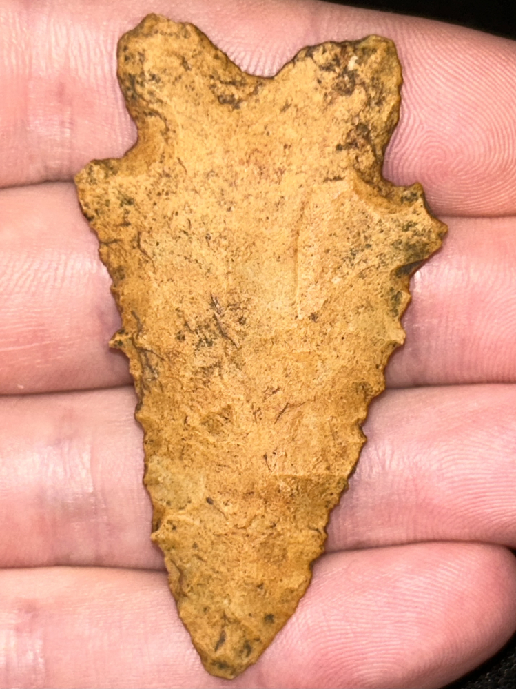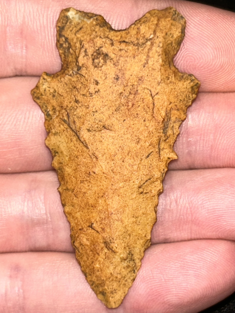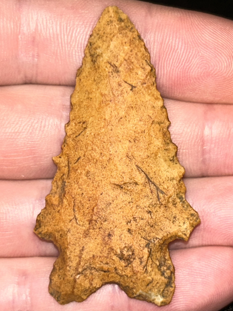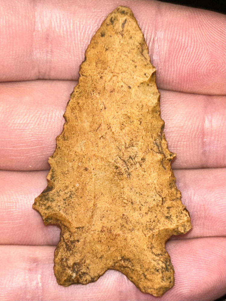 A fine MacCorkle found in Benton County, Tennessee. Made from water stained chert (likely Fort Payne) patinated to an attractive pumpkin orange-brown. Thin with excellent flaking and lightly serrated edges.