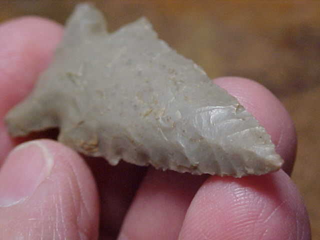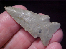 A fine piece, this Kirk Cornernotch dart point--comes from the S.W. Corner of the Hoosier state--I think Posey County, but I've had the point for most of a quarter century, the I.D. tag long since fell off. Regardless, 100% guaranteed real in every detail. Length is 1&15/16" by 15/16", barely over 1/4" thickness measured by caliper. Being Kirk Culture, the basal edge has the "bare minimum" (Kirk standard) edge grinding--you feel the grinding more on the corners of the stem than the center. One face shows some glue from the way the piece was displayed by the finder--likely a waterbased glue that'll come off easily. A close up photo should show the extra fine pressure flaking the forms the tip--even if they were 'spotty' on basal grinding, Kirk Peoples were excellent flint knappers, angled (oblique) flaking. Skilled work. Shipping is $7.00 USPS minimum charge. I welcome payments by check, cash, or M.O>, but do not use paypal-type payments--Roy A.