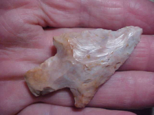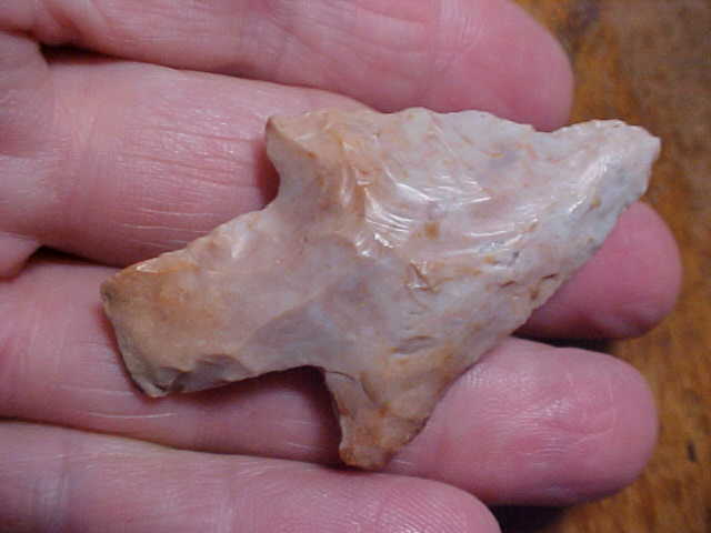 A heat-treated flint, that's about the best I can offer in terms of identifying the flint, I'm not sure what this Buck Creek point is made from--maybe a Burlington, but that's about as close of a guess as I could make--Hopewell peoples traded for flint from all over, and the point is out of a county (Posey Co.,Indiana) that was ground zero for the Hopewell. Length is 2&1/4" by 1&5/16"--the center being 3/8" thick makes me thing the blade was once considerably longer. The stem edges show some deliberate dulling/ light grinding. There is some yellowed glue on one side of the tip, so the point was once displayed in a frame (or on a board)--I've had the point in my collection for some twenty-five years, so you can understand why the glue is old and yellowed. Neat piece, REAL in every detail. Shipping is $7.00, checks, cash, or M.O.s can pay for it, but I do not use paypal-type payments--Roy A.