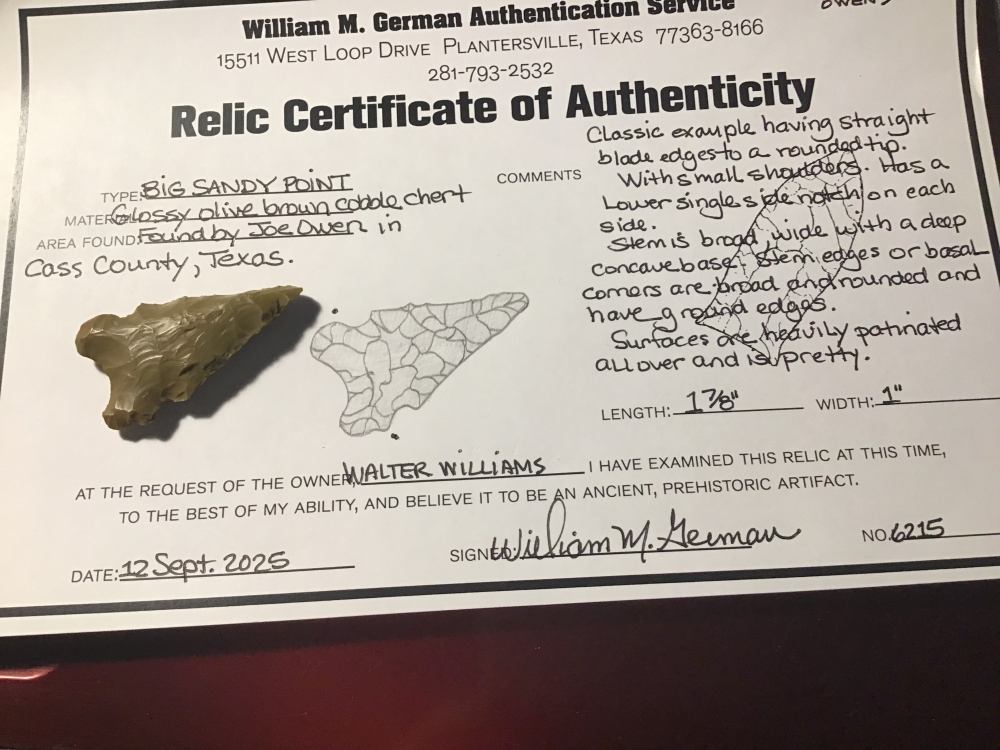 Very clear flaking on this concaved base Big Sandy point with ground base and stem. I have the finder and county on the Bill German coa. Beautiful material with small shoulders and blade edges have left- hand bevels to a nice tip. the base is thinned.