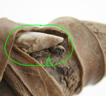 My thought after looking at this from as many angles as I can think of, is that a person - either Native or Pioneer, found the flint hoe which was not in its original handle, and then placed it in this handle so that they could put it back in use for tending their crops. Whether this was in the 1400's or 1800's is really hard to say without some scientific testing of the leather or wood. There is no doubt in my mind that this item as seen now was used just as it is for its intended purpose - cultivation. One fact that leads me to believe this hoe and handle set are have been together for at least a hundred years is the way that the wood wedge naturally adhered itself to the surface of the flint. My guess, and it is only a guess, is that it would take some time sitting for that to happen.